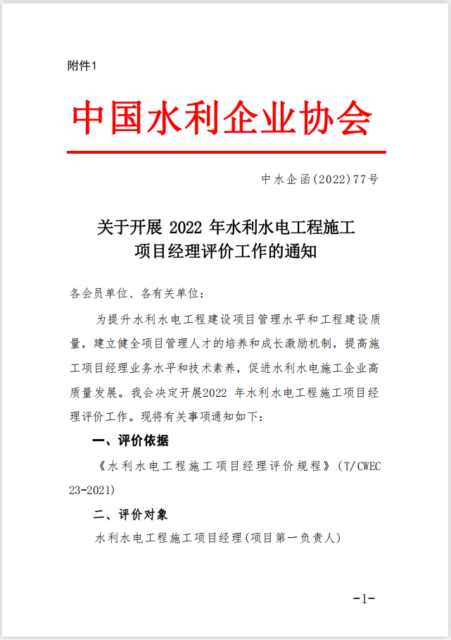 附件1:关于开展 2022年水利水电工程施工项目经理评价工作的通知.pdf